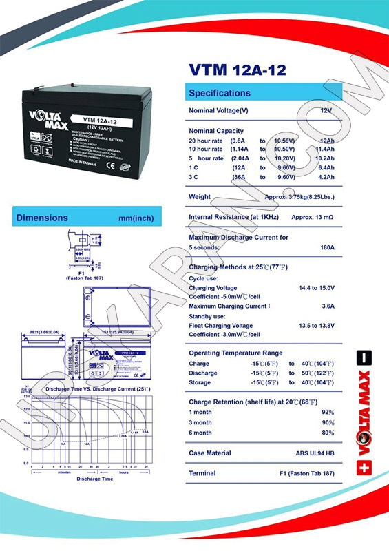باتری 12 ولت 12 آمپر ولتامکس از باتری های یو پی اس با آمپر متوسط بوده و مناسب برای یو پی اس های باتری خارجی است. بدلیل عمر طراحی بالای این مدل باتری از گزینه های مناسب برای یو پی اس های نصب شده در سازمانها و بیمارستان ها است. این باتری محصول شرکت ولتامکس و ساخت تایوان است.